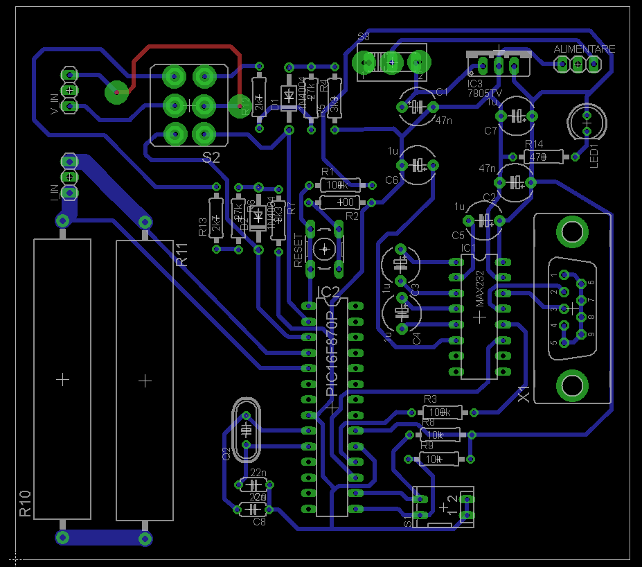 In cele ce urmeaza este prezentat PCB-ul , creat de asemenea in Eagle, pe care il vom realiza cu ajutorul unei placi cu un singur strat. Exista un fir ce va fi tras pe spatele placii pentru a evita un eventual scurtcirtuit.